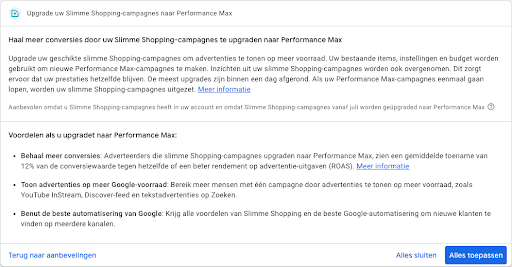 Google geeft aan dat wanneer de campagnes automatisch worden geüpgraded met behulp van de tool, de data van de eerdere slimme Shopping-campagnes worden overgedragen naar de nieuwe Performance Max-campagnes om consistente prestaties te behouden. De campagne-instellingen worden ook automatisch overgezet.