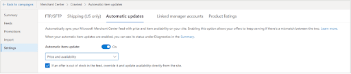 Microsoft Merchant Center zal de websites van adverteerders doorzoeken en prijs- en beschikbaarheids gegevens verzamelen voor de aangeboden producten. Als er een prijswijziging of een beschikbaarheidsprobleem wordt gedetecteerd (bijvoorbeeld als een artikel niet op voorraad is), wordt de productinformatie in uw advertenties bijgewerkt.