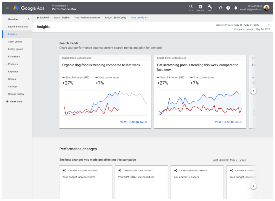 Binnen het bestaande inzichten tab zullen adverteerders voortaan meer inzichten krijgen over hun Performance Max campagnes. Denk hierbij aan inzichten omtrent best presterende doelgroepen, klantgedrag en de veiling. Hoewel adverteerders de data niet per sé direct kunnen gebruiken om op te reageren, geeft het wel mooi inzicht in wat performance drijft.
