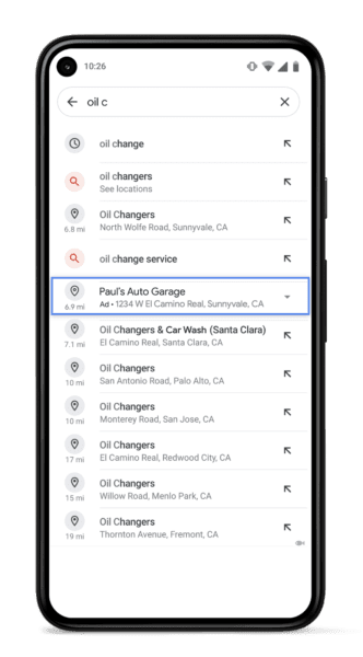 De eerste update die is aangekondigd, is de Auto Suggest functionaliteit (afbeelding 1). Deze advertenties worden getoond wanneer iemand in de buurt van jouw bedrijf aan het zoeken is naar een andere locatie. Advertenties worden vervolgens in automatische suggesties vertoond.
