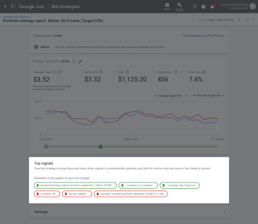 Google geeft adverteerders meer inzicht in de factoren die hebben bijgedragen aan de prestaties van geautomatiseerde biedstrategieën, ofwel smart bidding. Deze ‘top signals’ kunnen adverteerders tevens als input gebruiken voor hun bredere (online) marketing strategie, aldus Google. In eerste instantie zijn deze factoren alleen inzichtelijk voor de biedstrategieën Doel-CPA en Aantal conversies maximaliseren. De volgende factoren kunnen tot de ‘top signals’ behoren: apparaattype, locatie, dag van de week, tijd van de dag en zoekwoorden. Deze signalen kunnen ook worden gecombineerd.