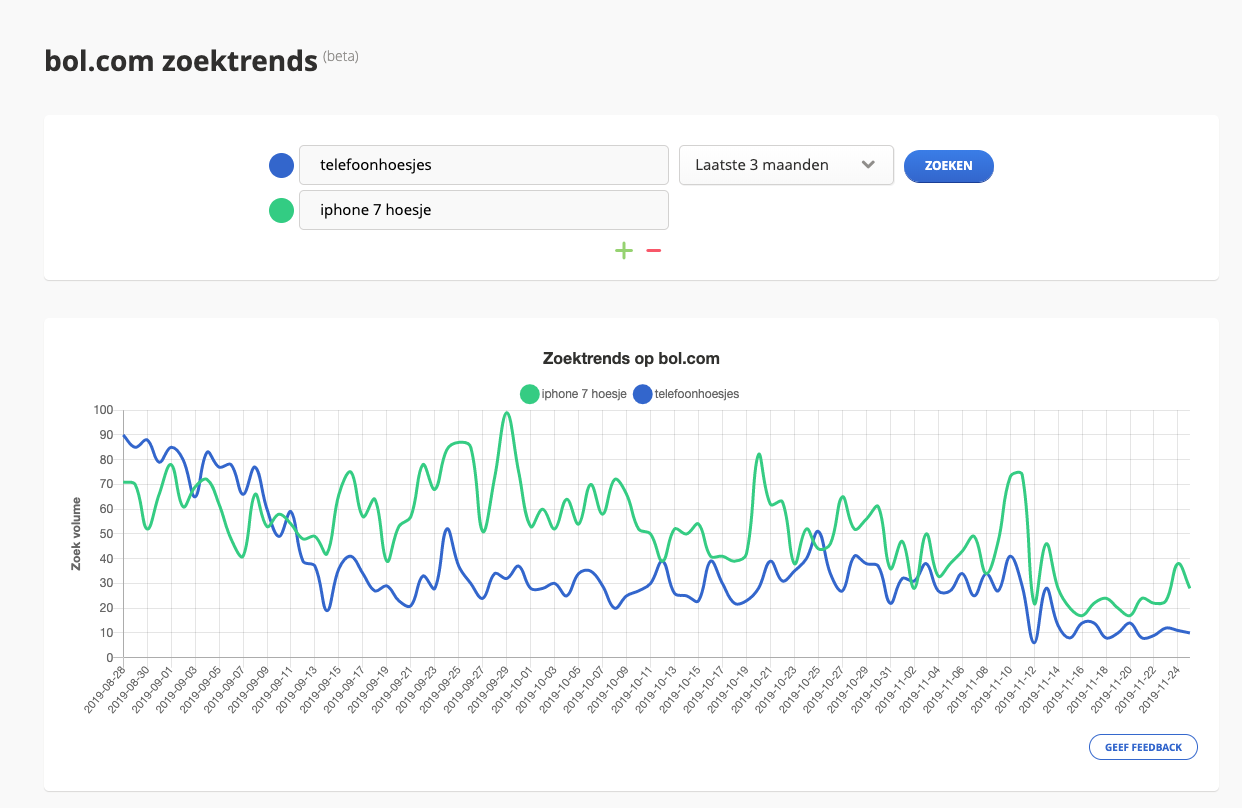 Bol.com heeft recent aangekondigd dat Bol.com Zoektrends gelanceerd wordt, een tool die nog wel in beta beschikbaar is. Met deze tool kun je als adverteerder zien in welke periode het meest op een bepaald zoekwoord of product wordt gezocht en wat de trend van het betreffende zoekwoord of product is. Met deze inzichten kun je als adverteerder dus meer uit je verkopen halen, omdat je beter kunt aansluiten bij de behoeften van klanten.