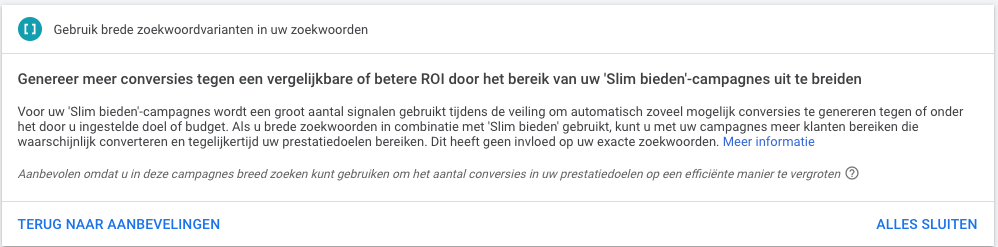 Door het gebruik van match types hadden we controle over het bereik en de relevantie van onze campagnes. Google wil echter dat we hier langzaam vanaf stappen en vertrouwen in de slimme biedstrategieën. Run je op dit moment campagnes met smart bidding? Dan hoef je niet gek op te kijken als je binnen optimalisaties bovenstaande aanbeveling vindt. Door brede zoekwoorden in combinatie met smart bidding in te zetten, wordt er volledig gebruik gemaakt van het bredere bereik met slimme signalen tijdens de veiling om het potentieel binnen Google Ads volledig te benutten.