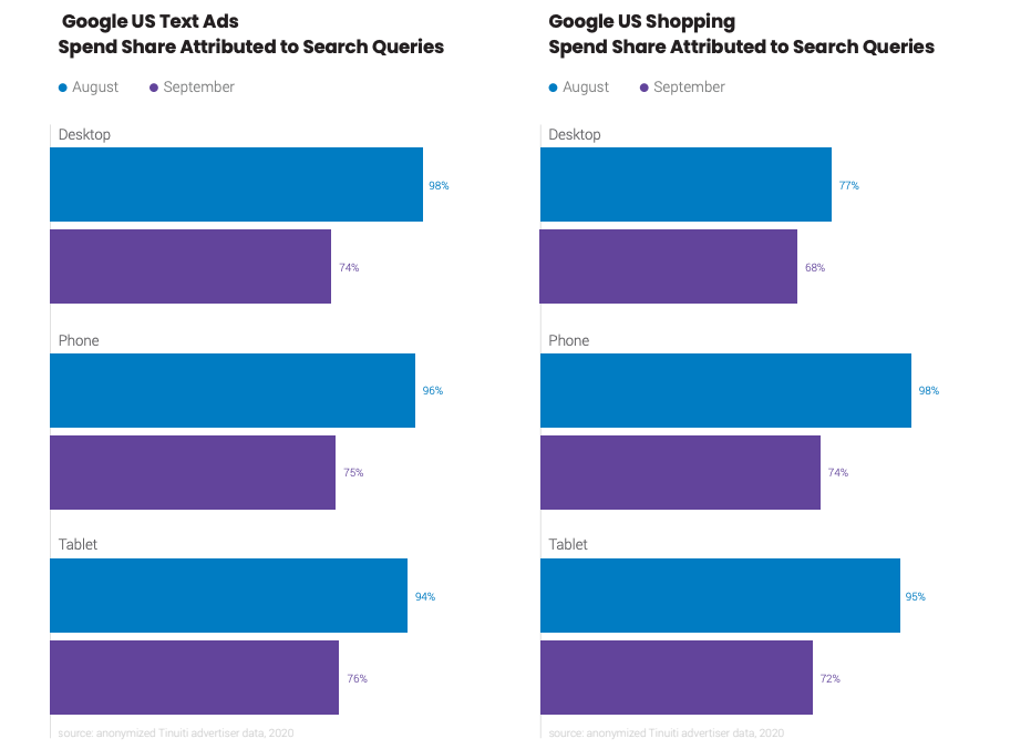 De grafiek laat zien dat in augustus, voor de update, nog bijna 100% van alle kosten terug te vinden en te herleiden was in het zoekterm rapport. Een maand na de update is dit met meer dan 20% gedaald. Het resultaat is dus dat men minder inzicht heeft in de zoektermen, die door zoekwoorden worden getriggered. Daarnaast heeft men duidelijk minder inzicht in de advertentiekosten van de verschillende zoektermen. Door deze ontwikkeling wordt het proactief toevoegen van uitsluitingszoekwoorden, door middel van bijvoorbeeld Google Keyword Planner, nog belangrijker.