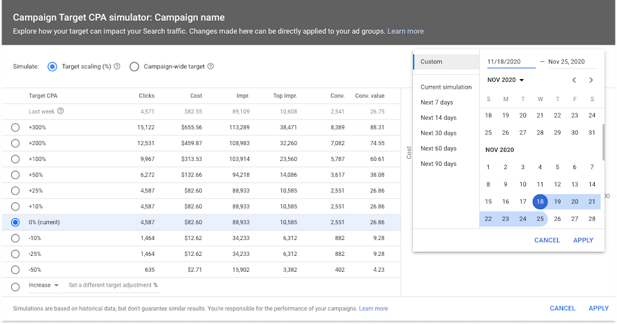 Het was al mogelijk om prestaties te voorspellen op basis van de afgelopen zeven dagen aan campagnegegevens. Met de nieuwe update is het mogelijk om een prognose te maken tot maximaal 90 dagen in de toekomst. Als je dit kiest gebruikt Google nu seizoensgebonden factoren om nog beter te kunnen voorspellen wat het effect is van budget- of doelwijzigingen.