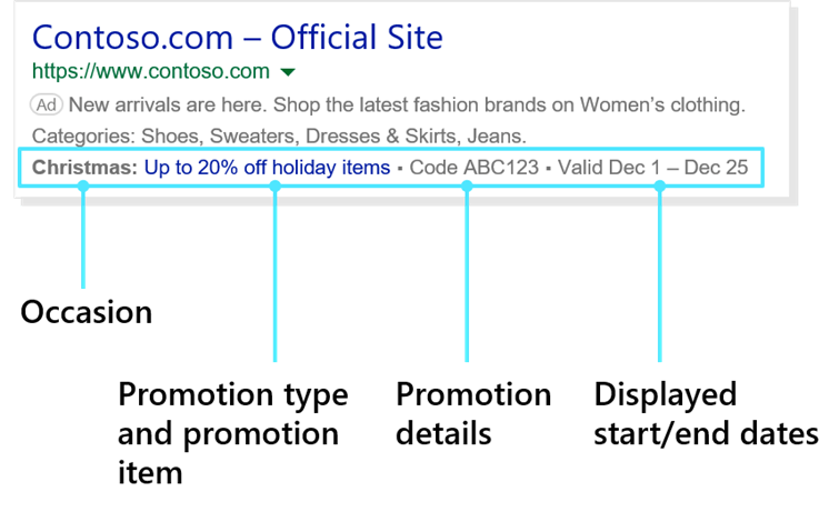 Promotie-extensies zijn nu beschikbaar voor Microsoft Advertising-accounts in de VS. Deze zijn vergelijkbaar met promotie-extensies van Google Ads, inclusief de mogelijkheid om te kiezen uit een lijst met evenementen of gelegenheden. Denk hierbij aan: Kerst, Black Friday of Cyber Monday.