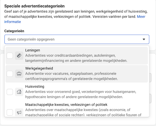 Bedrijven die zich voelen aangesproken tot bovenstaande branches, krijgen te maken met een aantal restricties op gebied van targeting. Qua locatie is het niet meer mogelijk om een radius kleiner dan 15 km te targeten. Verder kun je niet meer richten op specifieke geslachten, leeftijden en postcodes.
