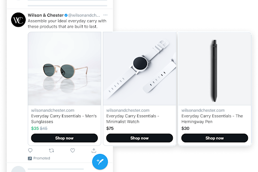 Het laatste formaat dat Twitter update, is de Collection Ad. Adverteerders die ook via Pinterest & Facebook adverteren zijn vast bekend met dit advertentietype. Collections Ads laten gebruikers een Hero afbeelding zien met daaronder product thumbnails. De Hero afbeelding is statisch waarbij men door de product thumbnails kan scrollen.