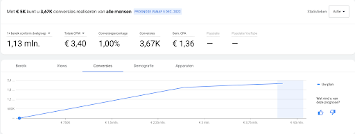 De bereikplanner tool van Google is de ideale tool om prognoses te maken van jouw aanstaande campagnes. Door middel van inschattingen op basis van doelgroep, historische performance & advertentieindeling geeft Google een schatting van mogelijke prestaties binnen het gestelde budget.