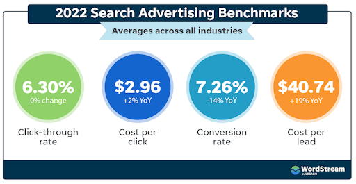 Het rapport laat ook een afname van het conversiepercentage zien. De mogelijke oorzaak hiervan is dat brede zoekwoorden meer algemene zoekopdrachten en klikken in de trechter binnenhalen. Liefst 91% van de sectoren zag een daling van ongeveer 14% in totaal ten opzichte van 2021.