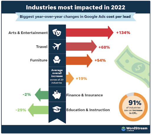 Een nieuw rapport, waarvan de gegevens afkomstig zijn uit meer dan 79.000 klantcampagnes met zoekadvertenties van oktober 2021 tot en met september 2022, laat zien dat de kosten per lead voor ongeveer 91% van de sectoren in Google zijn gestegen. De cost-per-lead (CPL) is in de sectoren kunst & entertainment (+134%), reizen (+69%) en meubels (+54%) het sterkst toegenomen. Branches die een daling van de CPL zagen zijn Finance & Insurance (-2%) en Education & Instruction (-29%). Over alle 23 sectoren zijn de kosten per lead met 19% toegenomen.