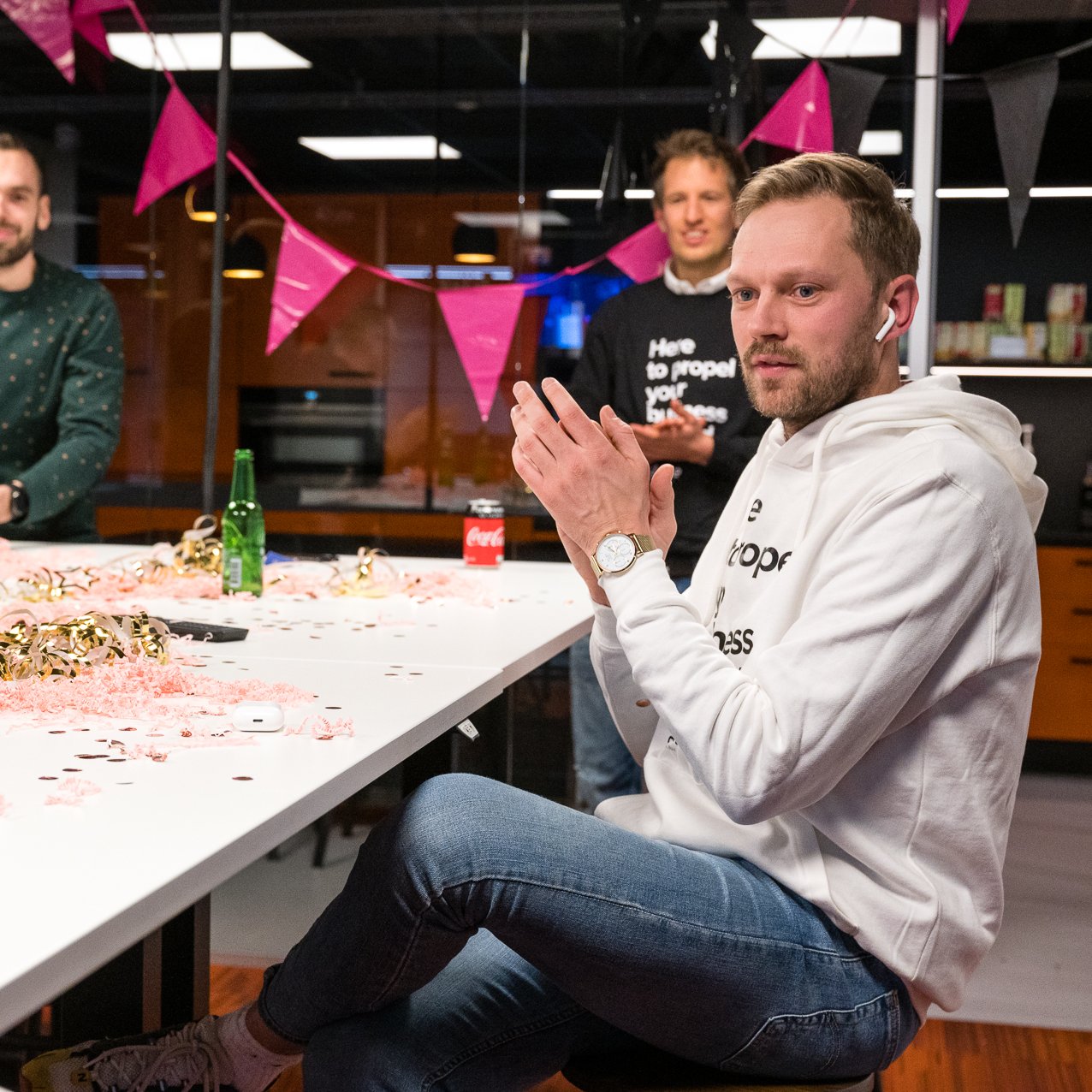 De Dutch Search Awards zag er dit jaar overigens anders uit dan andere jaren: Digitaal via een live-stream. Nu zijn we bij Adwise de moeilijkste niet en maken we er graag zelf een feestje van. We toverden gisteravond onze (Corona-proof) vergaderruimtes om tot feestelijke DSA-ready-ruimtes met hapjes, drankjes en confetti kanonnen, zodat alle klantteams veilig, maar toch samen, de awardshow konden bekijken. We regelden onze vaste host en collega Junior, die vanuit onze HQ iedereen meenam door de avond. Alle vergaderruimtes, de live-stream van de DSA, onze host Junior en alle Adwisers thuis kwamen samen in een live-stream. Zo konden we toch samen met heel Adwise genieten van het event.