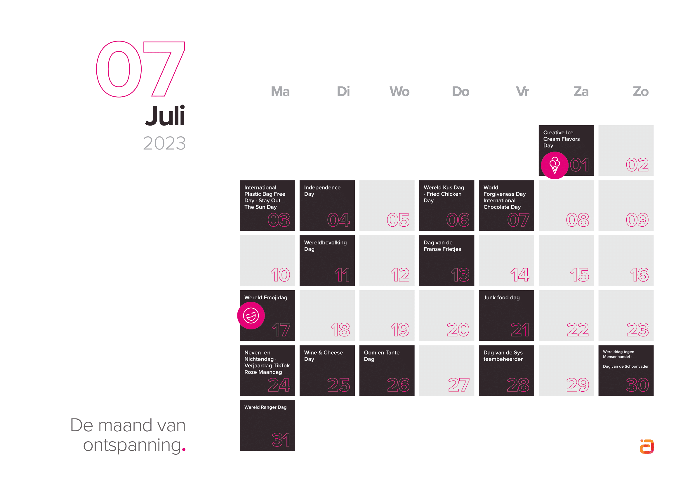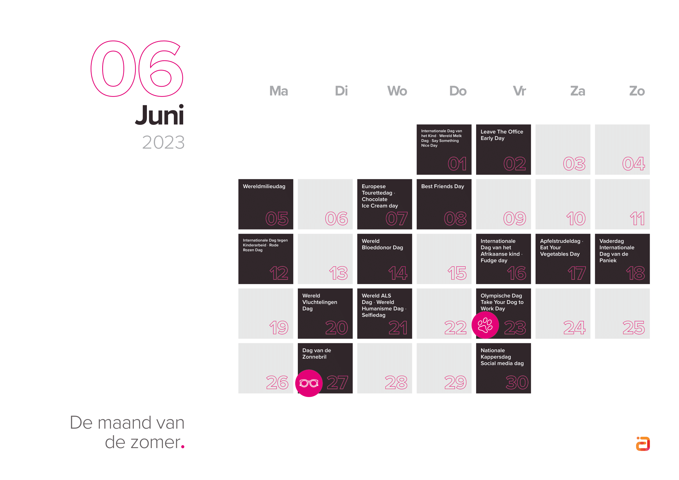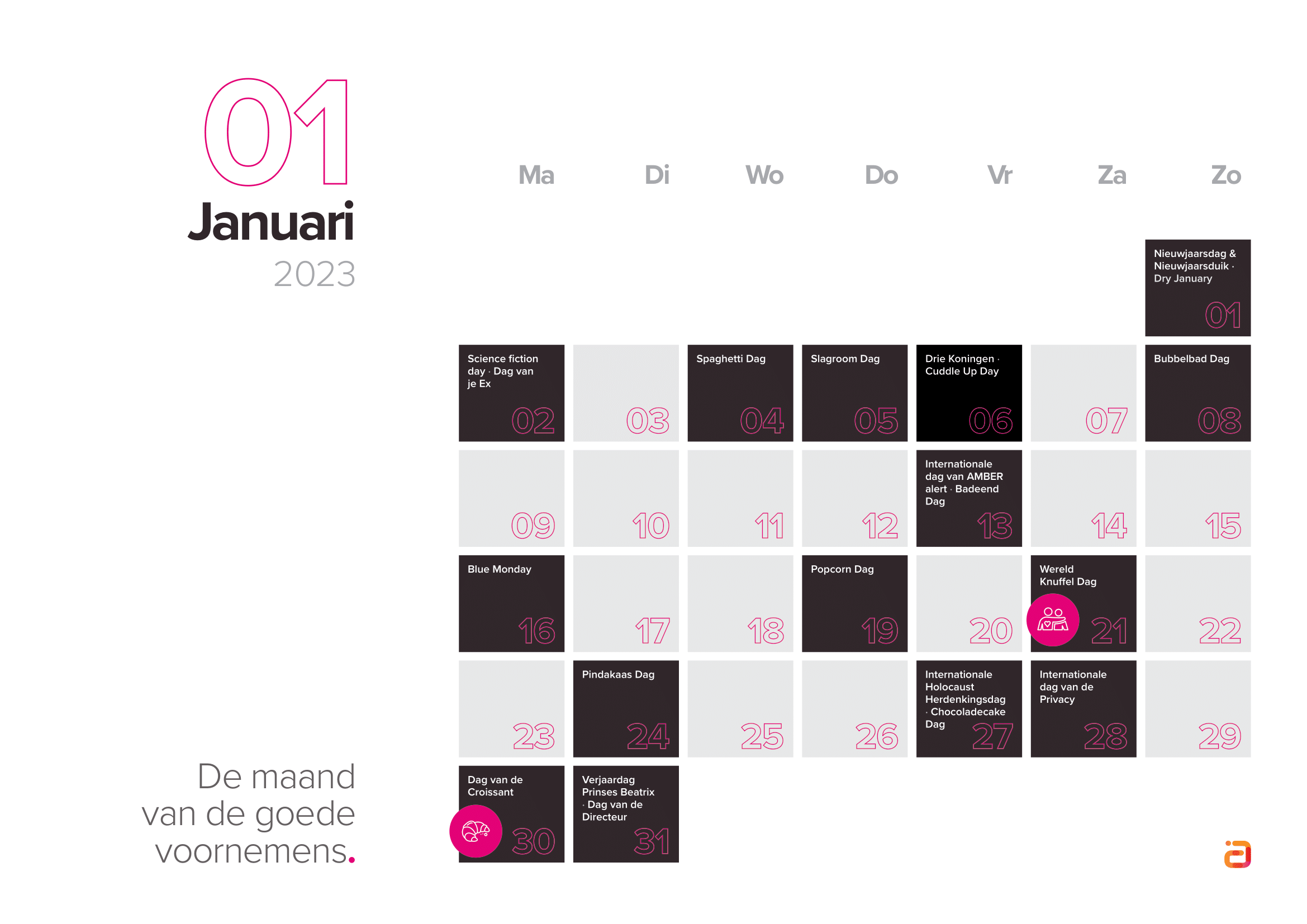 Houd bij het kiezen van inhakers rekening met je doelgroep en wat zij belangrijk vinden. Selecteer dus de inhakers die aansluiten op jouw merk en je doelgroep. Bekijk de inhaakkalender 2023 hieronder, of download de kalender direct.