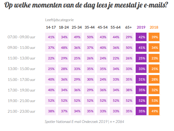 Welke learnings kunnen we hieruit trekken? Het loont bijvoorbeeld om te testen om vaker buiten kantooruren te mailen. We zien dat de meeste commerciële e-mails worden verstuurd binnen kantooruren, maar uit het onderzoek blijkt dat de ontvanger ze meestal checkt buiten deze tijden.