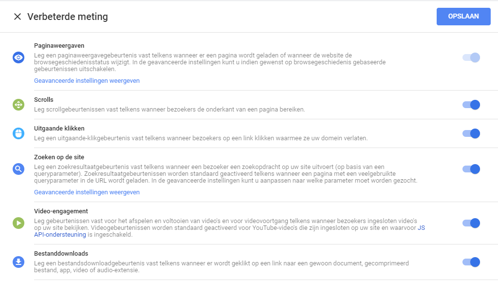In de huidige Google Analytics moet je events handmatig (via Tag Manager) instellen om het in de rapportages op te nemen. In de App + Web versie staan events die automatisch gegenereerd kunnen worden, zoals scrolls, outbound clicks en downloads. Voor deze standaard events is geen tussenkomst van de Tag Manager meer nodig. Je kunt wel met Tag Manager specifieke events tracken die niet in de automatisch te genereren events van de App + Web property staan.