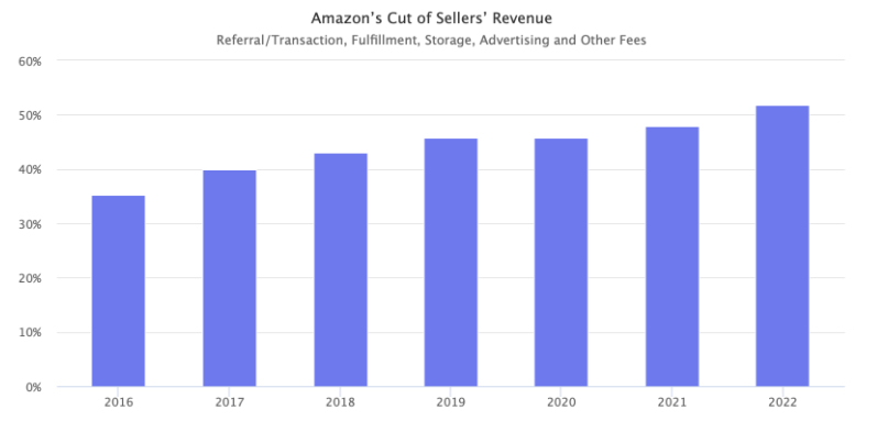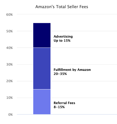 Net als voor SEA en Social zien we bij Amazon stijgende kosten. De oorzaak van deze stijging is niet eenzijdig. Zo hebben adverteerders op het platform te maken met stijgende CPC’s en zien we een stijging in fulfillment kosten voor partners die kiezen voor FBA (fulfillment by Amazon). Hieronder een verdere uitsplitsing per kostenpost op Amazon. Deze conclusies worden gerapporteerd door Marketplacepulse die P&L analyses van meerdere verkopers hebben vergeleken.