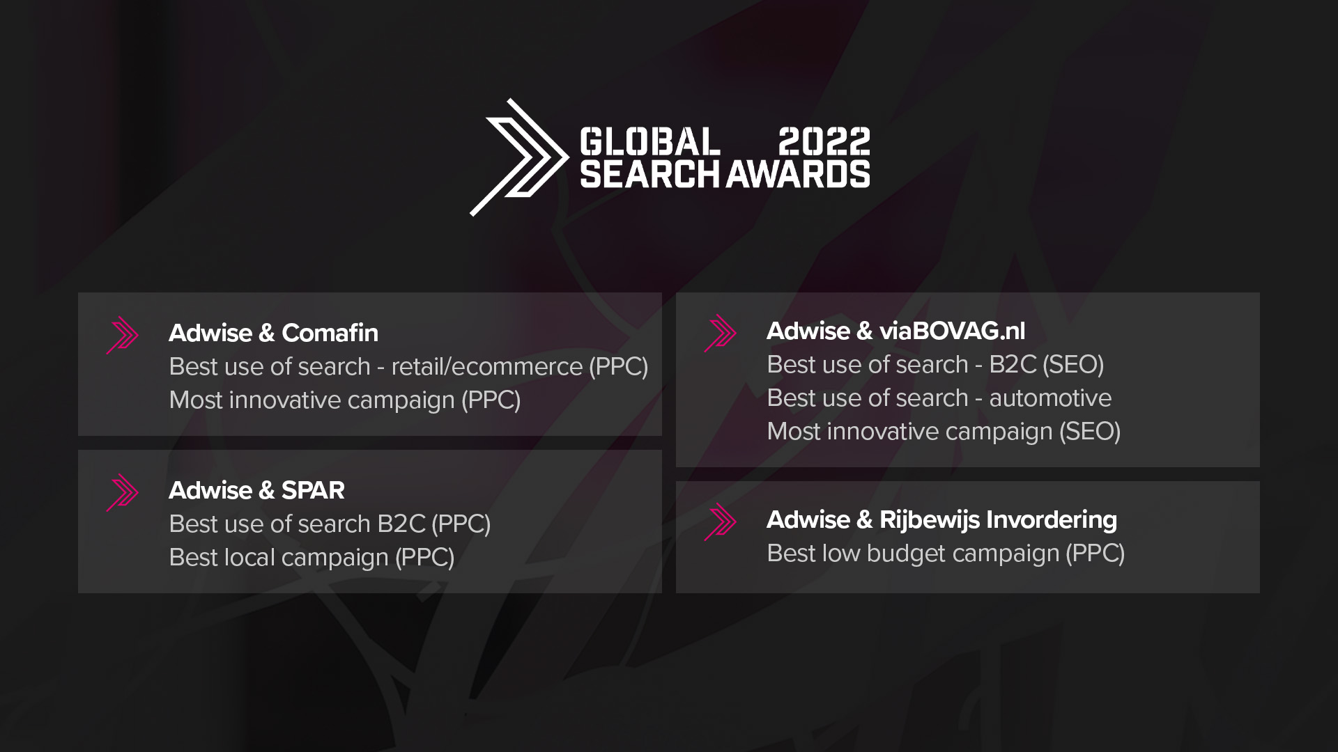 Na het recordaantal nominaties bij de European Search Awards, staat de naam van Adwise ook bij de wereldwijde editie vaker dan ooit op de shortlist. Onze samenwerkingen met SPAR, viaBOVAG.nl, Comafin en Rijbewijsinvordering werden in diverse categorieën met in totaal acht nominaties bekroond. Een prachtige erkenning en bevestiging van de impact die we samen met onze opdrachtgevers blijven maken. We feliciteren alle winnaars die gisteren een Global Search Award in ontvangst mochten nemen.