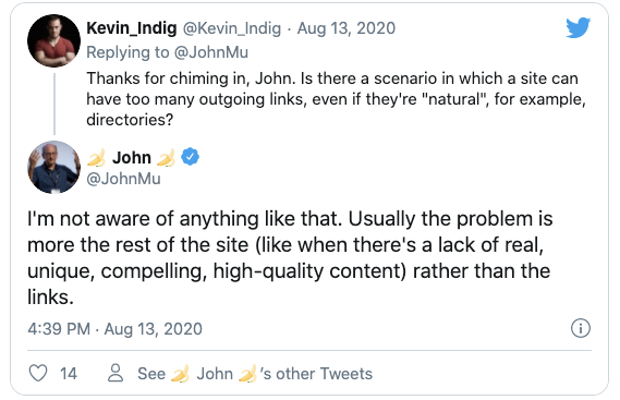 Aan John Mueller van Google werd gevraagd of er zoiets bestaat als het hebben van te veel uitgaande links, zelfs als die links natuurlijk zijn. John zei: "Ik ben me niet bewust van zoiets." Hij voegde er wel aan toe dat er misschien een situatie is waarin je content mist omdat je zoveel links hebt, zoals directories.