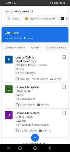 Afgelopen week heeft Google een nieuwe vacature zoekfunctie in Google Zoeken geïntroduceerd. Met de nieuwe functie zien gebruikers die op zoek zijn naar vacatures direct in de zoekresultaten relevante vacatures die aansluiten bij hun zoekopdracht. Voor deze nieuwe zoekfunctie werkt Google in Nederland onder andere samen met DPG Recruitment (Nationale Vacaturebank en Intermediair), Randstad Groep Nederland (Randstad, Tempo-Team,Yacht, BMC), Monsterboard en Rijksoverheid (carrière platform Werken voor Nederland).