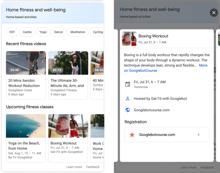 Google heeft nieuwe documentatie toegevoegd voor de structured data van thuisactiviteiten. structured data voor thuis activiteiten worden voornamelijk gebruikt voor activiteiten die je thuis kunt doen, zoals het bekijken van video's en online evenementen. Het wordt in de zoekresultaten van Google weergegeven als rich results. De rich results geven zoekers meer details over een video of online les, inclusief meer details zoals een beschrijving van de activiteit en hoe je je kunt registreren.