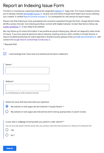 Google zei wel "voordat je een indexeringsprobleem rapporteert, raadpleeg altijd onze gemeenschapsforums en bekijk onze ondersteuningsdocumentatie, waarin enkele extra nuttige hulpmiddelen worden uitgelicht." "Ondersteuning is op dit moment beperkt tot het Engels, maar we zullen uitbreiding naar meer talen in de toekomst onderzoeken," voegde Google eraan toe.
