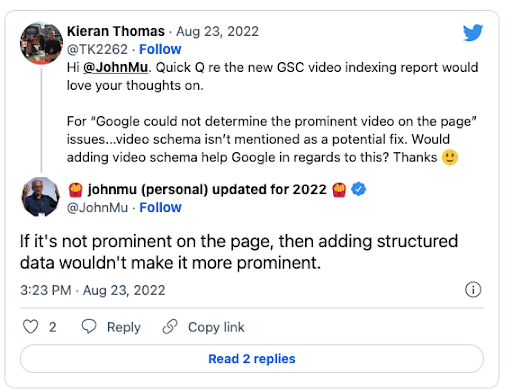 Google's John Mueller zei dat het toevoegen van video structured data aan pagina's met video's erop die video niet prominenter op die pagina zal maken. Dit komt door een video-indexering probleemmelding in Google Search Console.