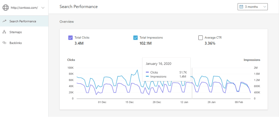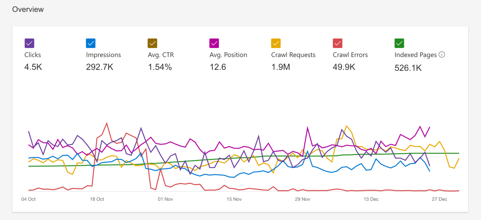 Microsoft heeft de statistiek 'gemiddelde positie' ergens in 2020 toegevoegd, maar de crawl verzoeken, crawlfouten en geïndexeerde pagina's zijn pas onlangs toegevoegd.