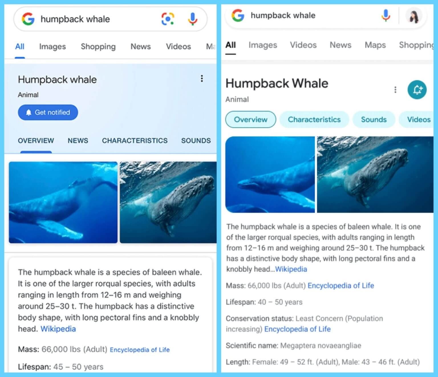 Het verschil tussen de oude en nieuwe fragmenten van mobiele zoekresultaten is subtiel. Hieronder zie je hoe ze eruit zien:
