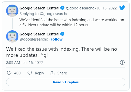 Google heeft bevestigd dat er problemen waren met het indexeren van nieuwe inhoud en het weergeven van inhoud in Google Search en op Google News. Het probleem begon op 15 juli in de morgen en Google bevestigde dit op Twitter door het volgende statement: "Er is een doorlopend probleem met het indexeren in Google Search dat een groot aantal sites beïnvloedt. Sites kunnen te maken krijgen met vertraagde indexering. We werken aan het identificeren van de hoofdoorzaak. De volgende update zal binnen 12 uur plaatsvinden."