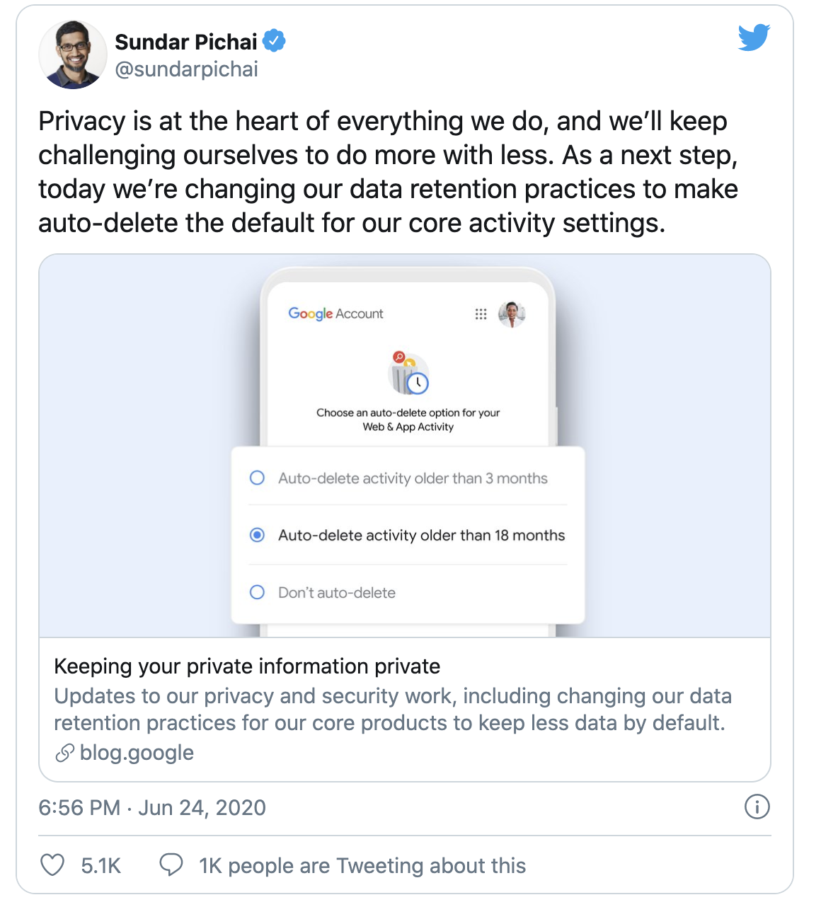 Google zei: “Vandaag veranderen we onze gegevensopslag om de standaardinstellingen voor onze kernactiviteiten automatisch te laten verwijderen”