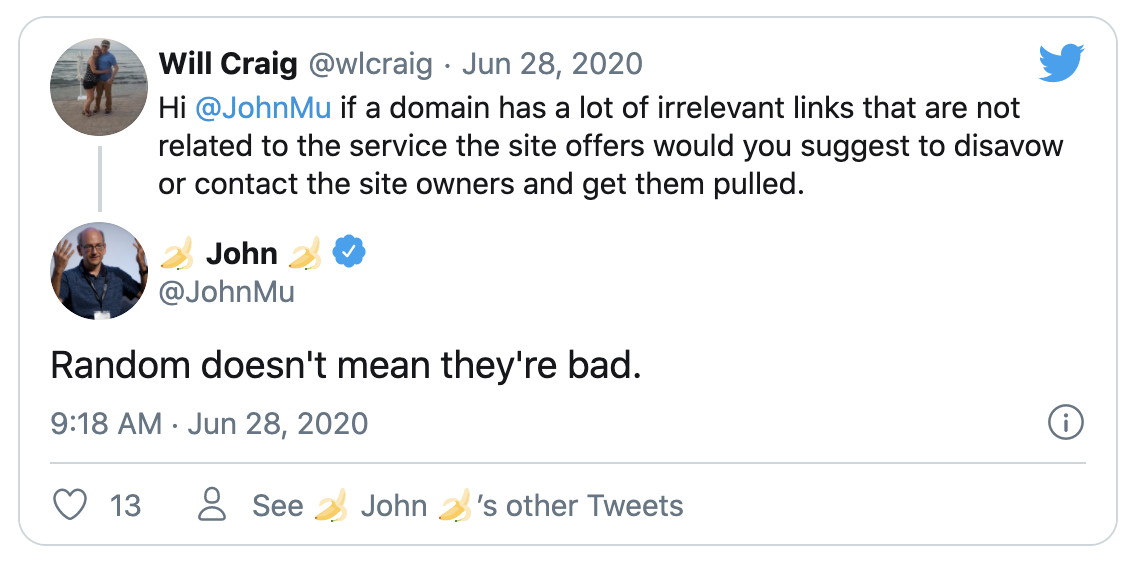 Aan John Mueller van Google werd via twitter gevraagd of men willekeurige of niet gerelateerde links die naar zijn site verwijzen, moet disavowen. De vraag was “als een domein veel irrelevante links heeft die geen verband houden met de service die de site biedt, zou u dan voorstellen om de links te disavowen of contact op te nemen met de site om ze te laten verwijderen?”. Hierop antwoordde John dat alleen omdat links willekeurig zijn, dit niet betekent dat ze slecht zijn.