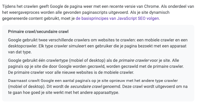 De sectie die je hierboven ziet is volledig nieuw. Hier wordt specifiek uitgelegd hoe Google omgaat met het crawlen/renderen van scripts op een webpagina. Daarbij geven ze expliciet aan dat als je gebruik maakt van dynamisch gegenereerde content (lees content ingeladen met JavaScript) je rekening moet houden met de JavaScript SEO basics. Daarnaast leggen ze uit dat webpagina's gecrawld worden met zowel een mobiele crawler als een desktop crawler.