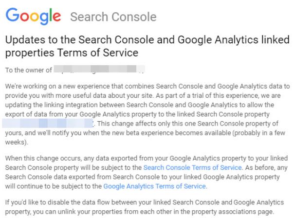 Search Engine Land heeft Google om commentaar gevraagd maar zonder succes. Wel hebben een aantal webmasters opeens een mailtje gekregen waarin de integratie van GA in Search Console als test van Google gesuggereerd wordt. Het gaat om onderstaande melding.