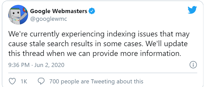 Op 2 juni heeft Google aangegeven dat er problemen zijn met de indexering. Hierdoor werden er oudere resultaten getoond. Google gaf dit aan in de volgende verklaring: "we ondervinden momenteel indexeringsproblemen die in sommige gevallen oude zoekresultaten kunnen veroorzaken." In april en vorig jaar hebben deze problemen zich ook voorgedaan.