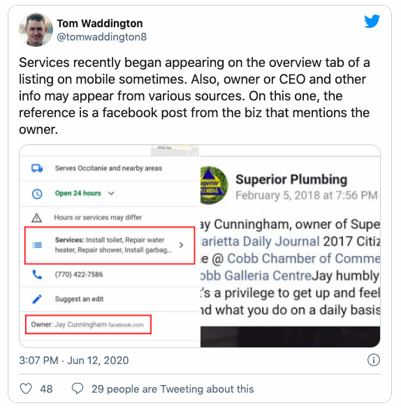 Het ziet er naar uit dat Google Mijn Bedrijf Facebook data gebruikt om Google Mijn Bedrijf profielen te vullen. Tom Waddington gaf het aan in een tweet die het voorbeeld gaf van Jay Cunningham. Op Facebook is te zien dat Jay Cunningham eigenaar is van ‘Superior Plumbing Services’, waardoor Google Mijn Bedrijf deze informatie toont. Er staat wel aangegeven dat de informatie komt vanaf Facebook.