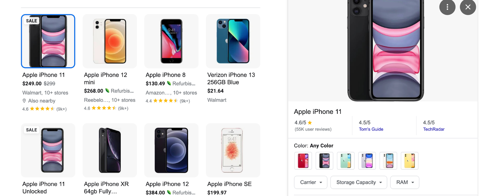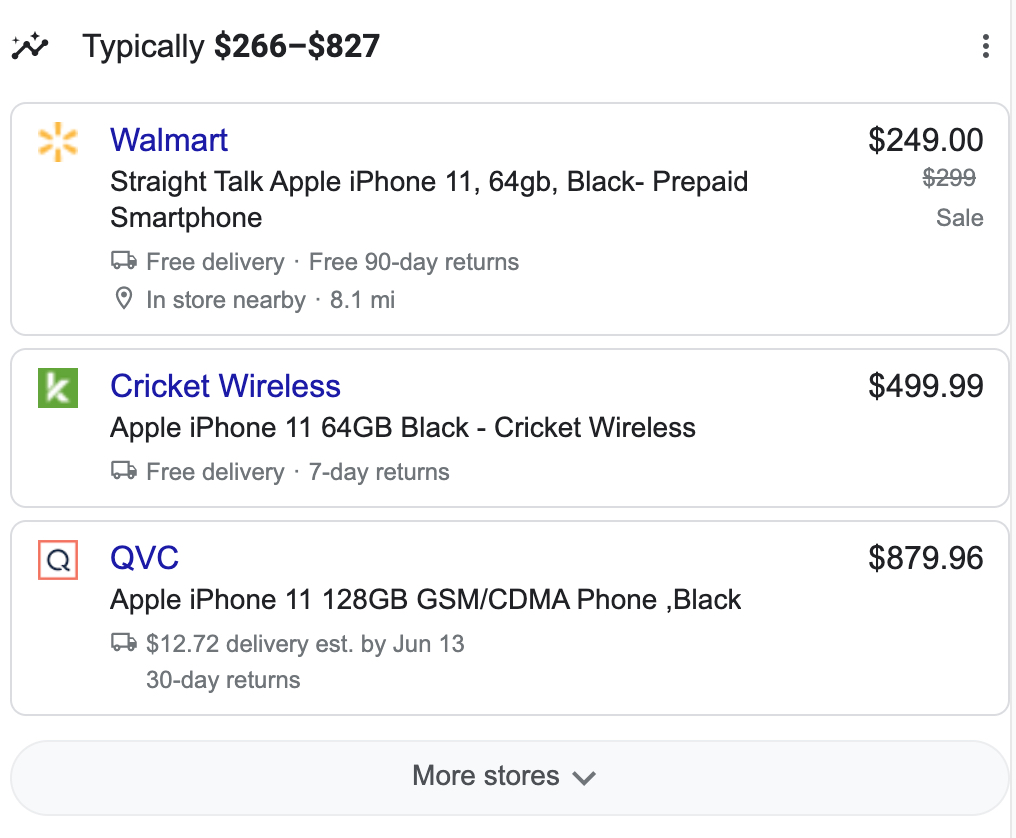 Ook geeft Google een lijst met locaties waar het product wordt verkocht en voor welke prijs het wordt verkocht. Hierin wordt dan ook gelijk aangegeven hoe dichtbij de winkel is, of er gratis bezorging is, hoeveel bezorgkosten het is en zelfs binnen hoeveel dagen je het product terug kunt sturen.