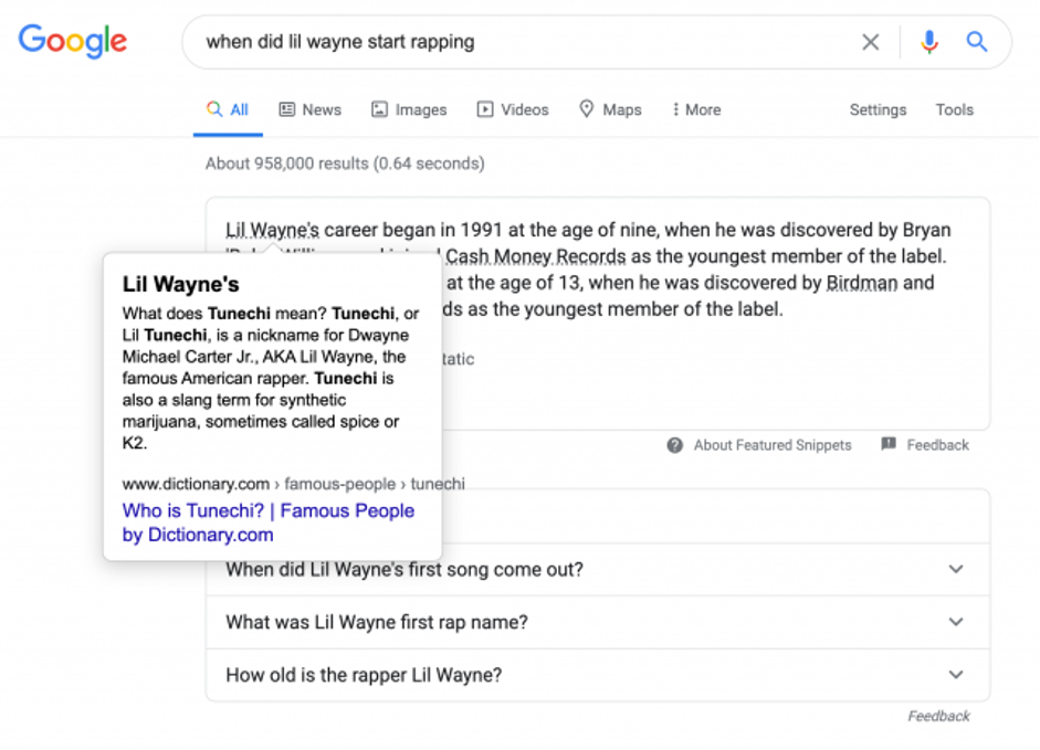 Google is bezig met het testen van een nieuwe functie binnen de featured snippet-resultaten. Dit vertaalt zich naar een overlay van data elementen afkomstig van andere websites dan de betreffende featured snippet. In de featured snippet zie je in dat geval een gestippelde onderstreping. Wanneer je met de muis over het element gaat, krijg je een overlay te zien van de andere site.