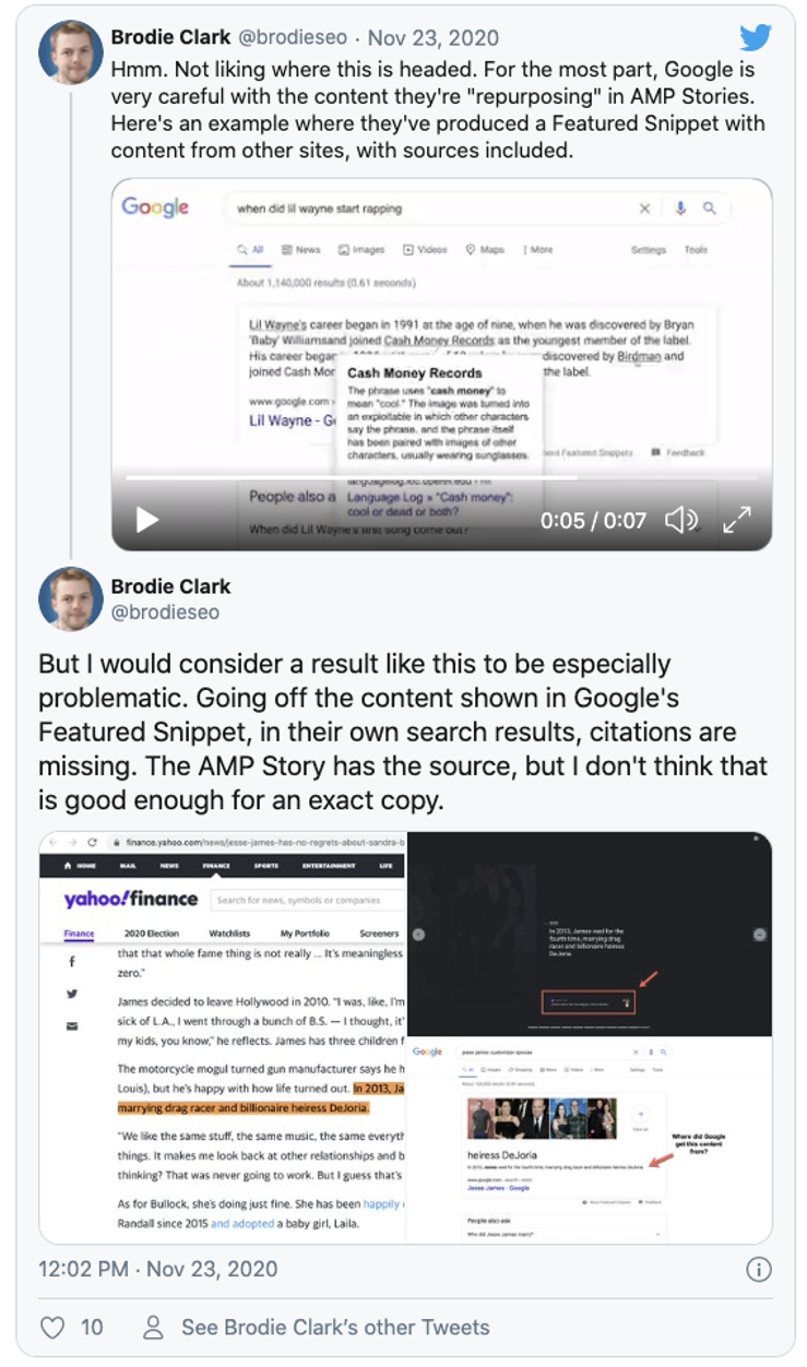 In het bovenstaande voorbeeld zijn er 3 gestippelde onderstrepingen zichtbaar, die alle 3 naar verschillende bronnen gaan. Daarnaast is de featured snippet zelf een Google AMP/Web Story, wat al ongewoon is. Allemaal automatisch gegenereerd door de Google AI. Dit is vorige week besproken door Brodie Clark op Twitter, zie onderstaande.