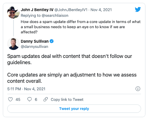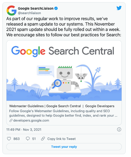 Google zei op Twitter "als onderdeel van ons reguliere werk om resultaten te verbeteren, hebben we een spam update vrijgegeven. Deze november 2021 spam update zou binnen een week volledig uitgerold moeten zijn. We moedigen sites aan om onze best practices voor Search te volgen."