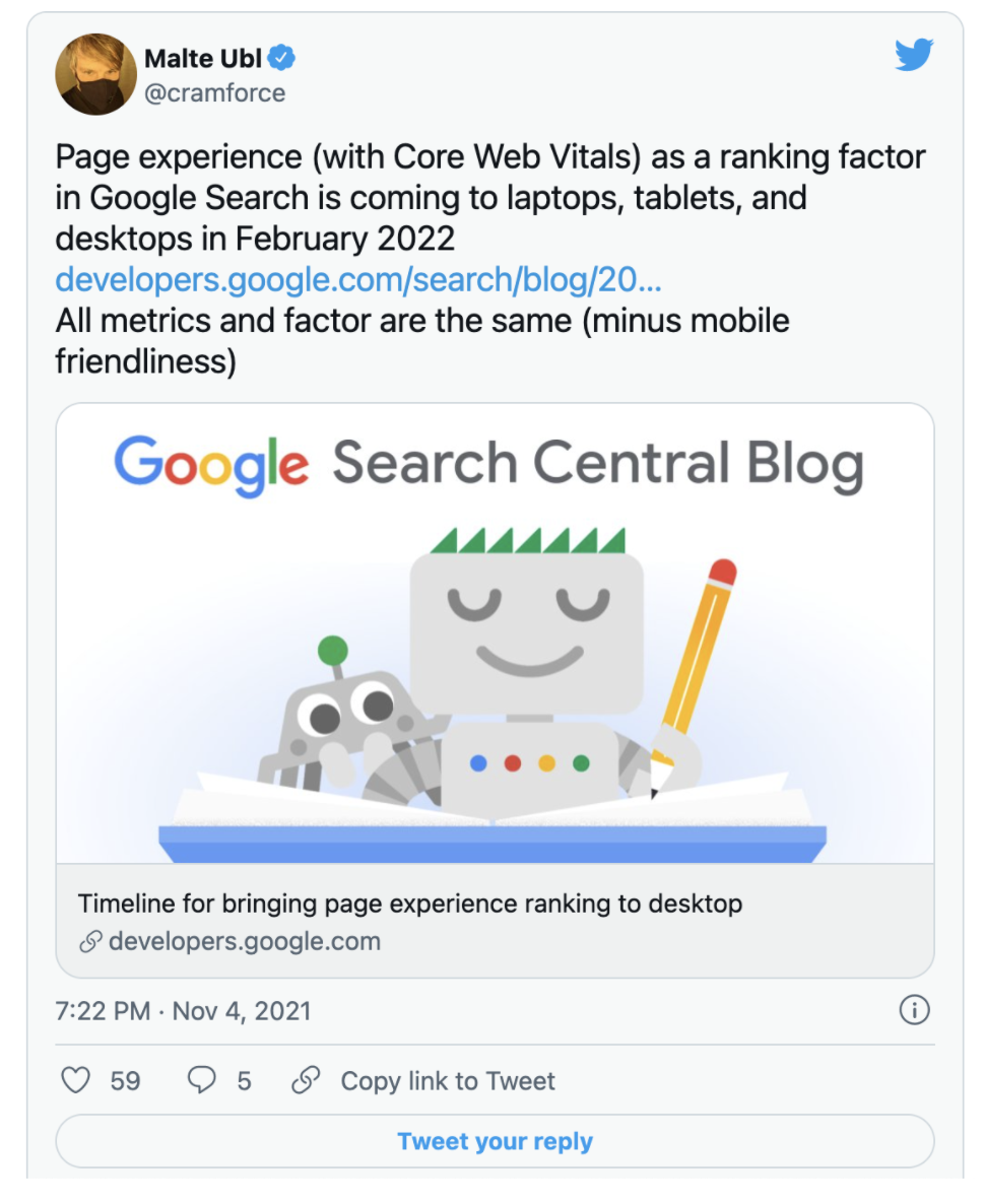 Jeffrey Jose van Google zei het volgende: "We beginnen met het gebruik van page experience als onderdeel van onze desktop ranking systemen vanaf februari 2022. De uitrol zal eind maart 2022 voltooid zijn. Deze ranking wordt gebaseerd op dezelfde page experience signalen die eerder dit jaar zijn uitgerold voor mobiel."