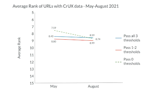 Maar dit onderzoek van Moz toont aan dat webpagina’s in Google vooral minder goed presteren als ze geen van de Core Web Vitals doorstaan. En dus niet zozeer beter presteren als ze alle Core Web Vitals doorstaan. In onderstaande grafiek zie je dit geïllustreerd.