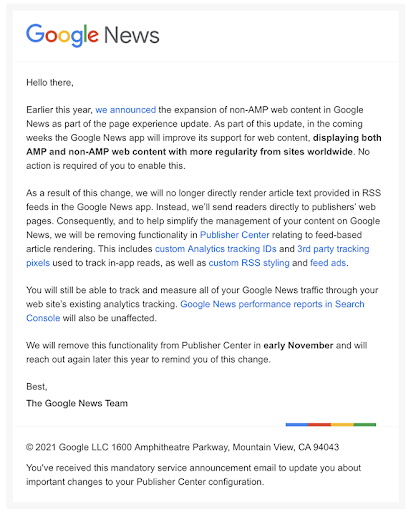 Update: Hier is de e-mail die Google News uitgevers stuurt over deze verandering die volgende week komt: