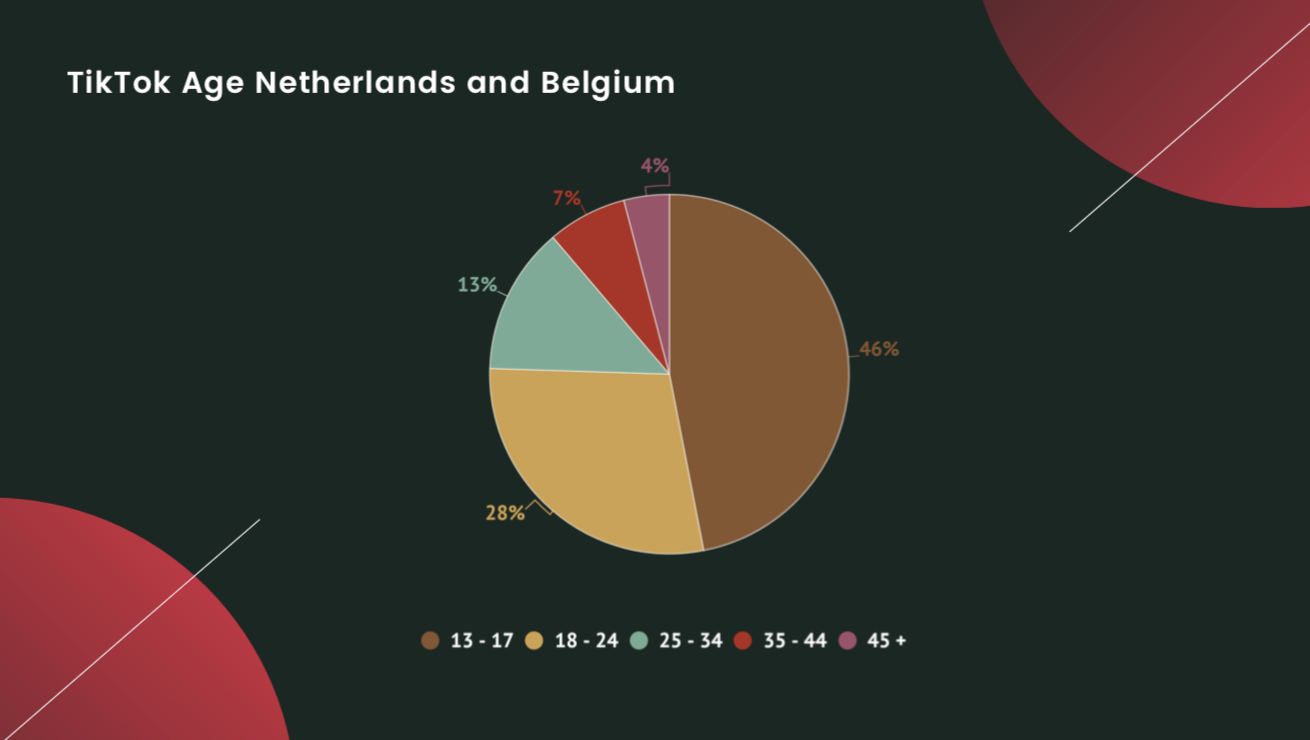 Hoe zit het dan met de gebruikers? Volgens HootSuite had het platform vanaf oktober 2019 800 miljoen actieve gebruikers en groeit het nog steeds in razend tempo. De teller staat inmiddels op 1,7 miljard gebruikers wereldwijd, waarvan 3,5 miljoen Nederlandse gebruikers. Een Nederlandse gebruiker opent de app gemiddeld 12 keer(!) per dag en spendeert er dagelijks gemiddeld zo’n 60 minuten. Wel een feit: TikTok gebruikers zijn gemiddeld jonger dan op andere platforms; de grootste groep gebruikers is de generatie Z. Newcom (2019) deed onderzoek naar de leeftijd van Nederlandse TikTok’ers en ontdekte een piek in gebruik in de leeftijd 9 tot 11 jaar. Creator Network publiceerde heel recent de leeftijdsverdeling van TikTok gebruikers in Nederland en België en daarin zie je terug dat de meeste TikTok gebruikers 13 tot 17 jaar zijn (46%) en daaropvolgend 18 tot 24 jaar (28%).