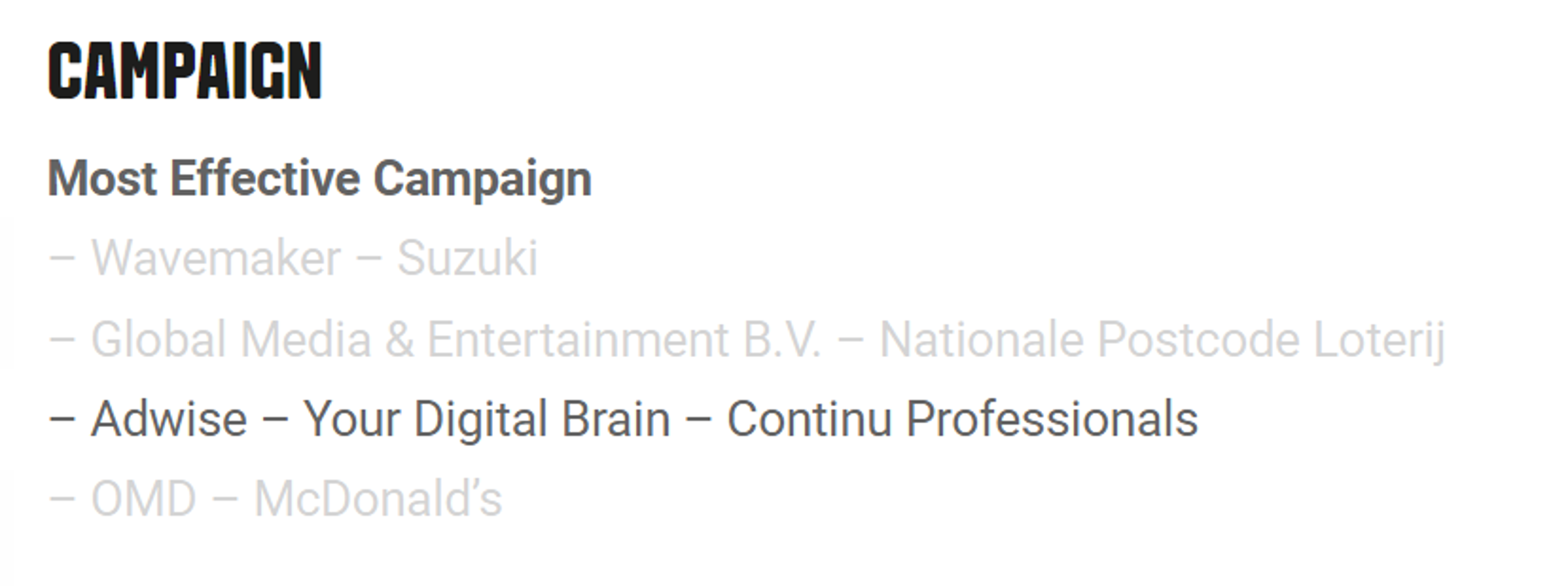 De categorie 'Most Effective Campaign' waar de samenwerking tussen Adwise en Continu Professional in is genomineerd, draait om de meest effectieve manier waarop doelstellingen zijn bereikt, uiteraard met behulp van programmatic advertising. Het rijtje genomineerden wordt verder gecompleteerd door topmerken McDonald's, Suzuki en de Postcodeloterij.