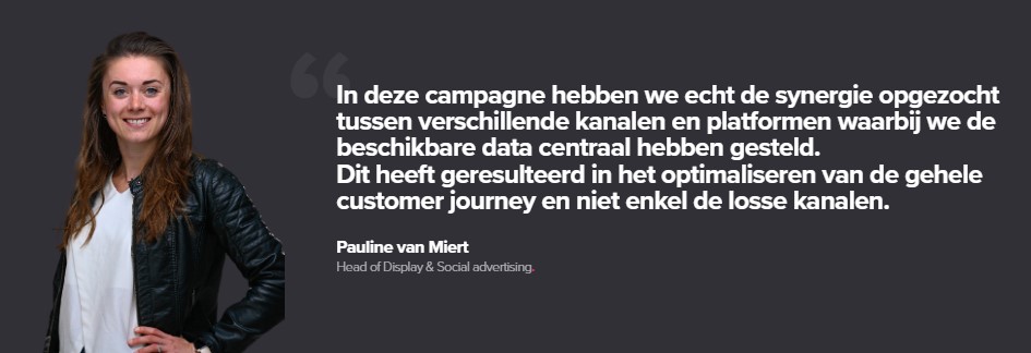 Met Customer Data Platform BlueConic hebben we data gecentraliseerd, geactiveerd én via DSP-koppelingen gebruikt om 360-graden klantprofielen te creëeren. Verdere segmentatie maakt specifieke targeting mogelijk, waardoor doelgroepen uiteindelijk dynamische ads te zien krijgen met heel gerichte ad teksten.