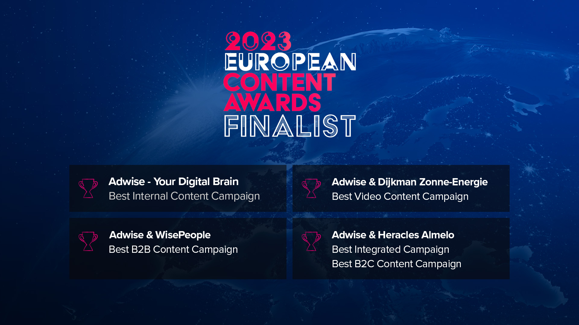Genomineerd voor Best B2B content campaign. Na eerder al bij de Global Content Awards genomineerd te zijn, dingt de zustersamenwerking tussen Adwise en WisePeople ook bij de Europese editie mee voor de prijzen. The Community of Digital Masterminds draait om het opschudden van de traditionele recruitment markt. Met een unieke merkidenteit en bijbehorende content brengt WisePeople opdrachtgevers en digitaal talent op een bijzondere manier samen. Met een 'community of Digital Masterminds' matcht WisePeople bedrijven aan digitale professionals, waarbij zowel een fit in kwaliteit en team als in professionele én persoonlijke groei het fundament vormt. Zo vinden klanten niet alleen snel nieuw talent, maar worden ook langdurige relaties opgebouwd.