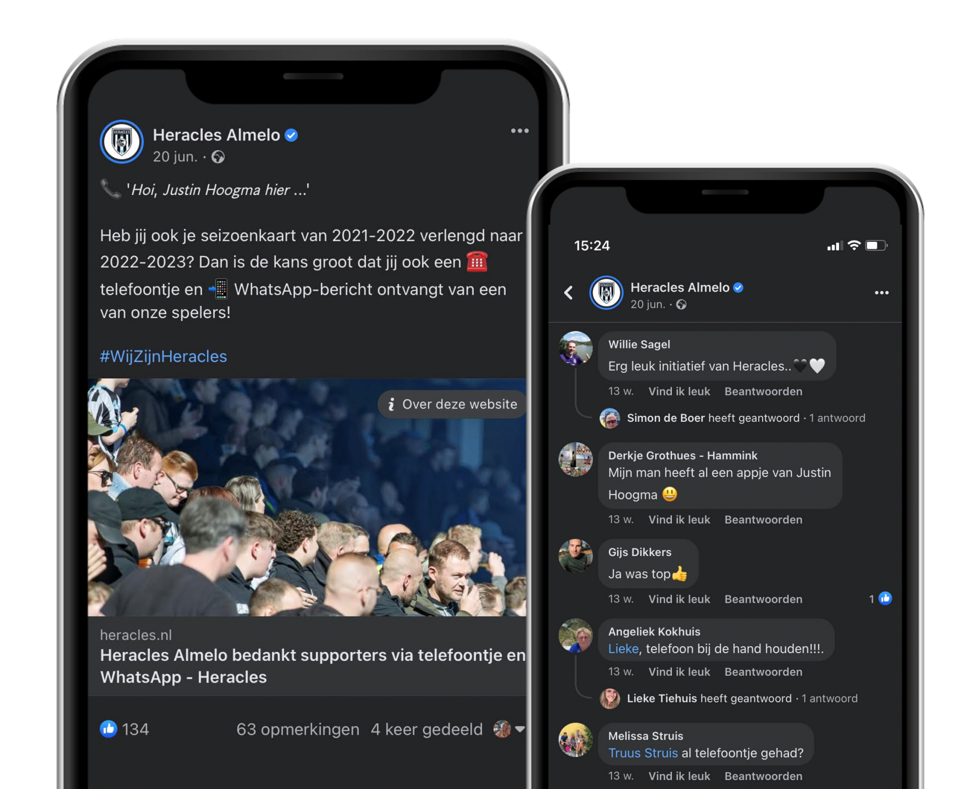 Seizoenkaarthouders ontvingen een automatisch telefoontje met een bericht van één van hun favoriete Heracles spelers. Hierin werden ze bedankt voor het verlengen van hun seizoenkaart. Ook kregen ze te horen dat ze een WhatsApp bericht zouden ontvangen, om door te sturen naar vrienden, familie of een mede Heraclied.