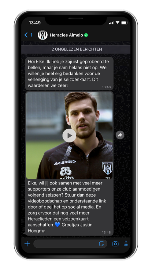 Als opvolging van het telefoontje volgt dus een WhatsApp bericht met een video, waarin een speler van Heracles aanmoedigt een seizoenskaart te verlengen. Ontvangers konden deze doorsturen naar vrienden, familie of mede Heraclieden om zo een nog grotere doelgroep te bereiken.