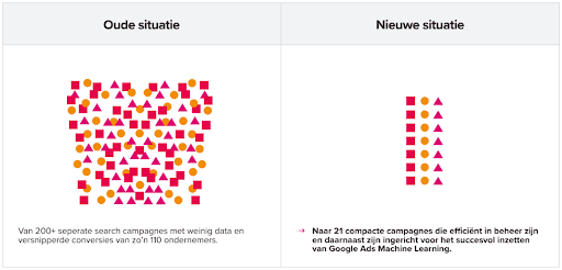- Consolidatie van meer dan 200 separate search-campagnes naar 21 compacte campagnes, die efficiënt in beheer zijn en bovendien optimaal zijn ingericht voor het succesvol inzetten van Google Ads Machine Learning.