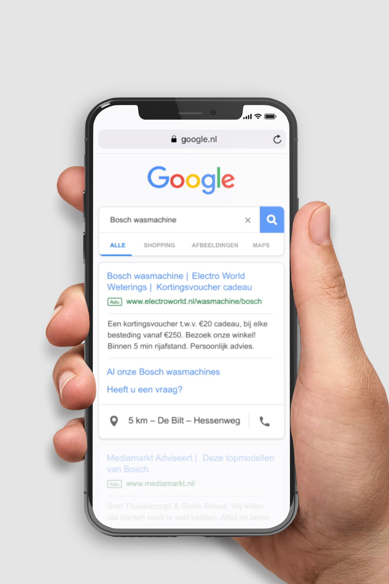 Met 280 vestigingen is er altijd wel een winkel in de buurt. In de advertenties verwerken we op een slimme manier locatiedata van de gebruiker. Door middel van locatiebepaling weten we hoe ver een consument verwijderd is van een vestiging. Op basis van die afstand bieden we in de biedstrategie binnen Google Ads hoger of lager voor een advertentie. Hoe dichter een gebruiker bij de vestiging is, hoe hoger de kans op een winkelbezoek. Zichtbaarheid in deze fase is dan ook essentieel. Omdat het lokale aspect van de formule belangrijk is, tonen we de naam van de fysieke winkel in de advertentie. Op die manier zijn we optimaal relevant.